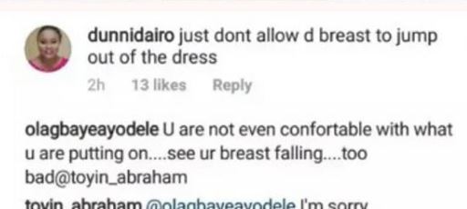 Another commenter, Olagbade Ayodele said, "U are not even comfortable with what you are putting on....see ur breast falling...too bad"