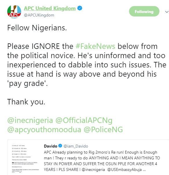 After accusing the All Progressives Congress of planning to rig today's rerun election in Osun, the ruling party has replied Nigerian musician, Davido.