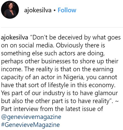 She wrote: “Don’t be deceived by what goes on on social media. Obviously there is something else such actors are doing, perhaps other businesses to shore up their income.