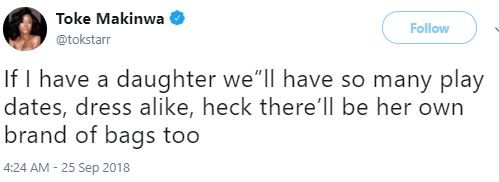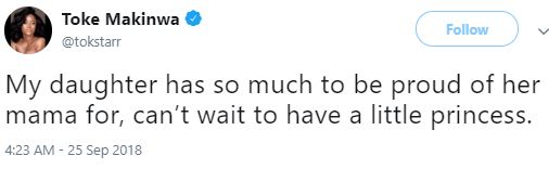Toke Makinwa, an on-air-personality, has said she can’t wait to have a daughter. She also added that her little princess would be proud of her.