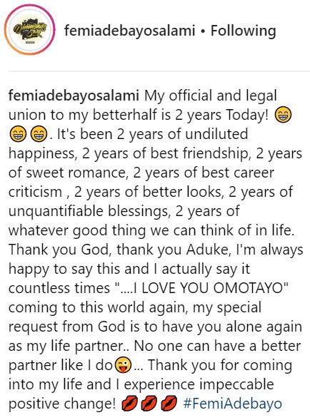 Nigerian actor, Femi Adebayo has celebrated being married for two years with some sweet words he sent his wife, Omotayo.