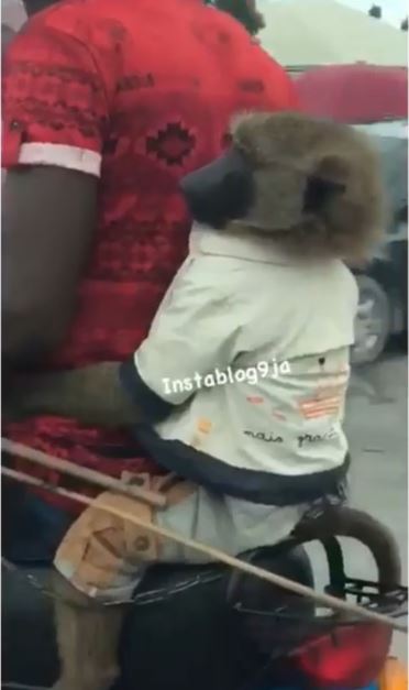 A young man in Lagos made people to raise their eyebrows after he was pictured with a baboon dressed as a human being holding him from behind on a bike.