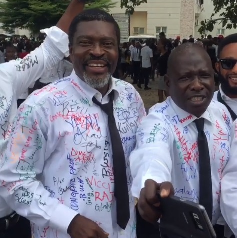 The legendary screen star who has spent over two decades in the movie industry, shared a video of himself and fellow graduands sporting autograph-adorned white shirts and black pants.