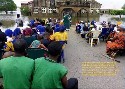 A resident of Anam, Anambra West Local Government Area, Mike Obiajulu, revealed that some Christians in the area insisted on holding their Sunday Service within the small portion of land they could find around their submerged church.