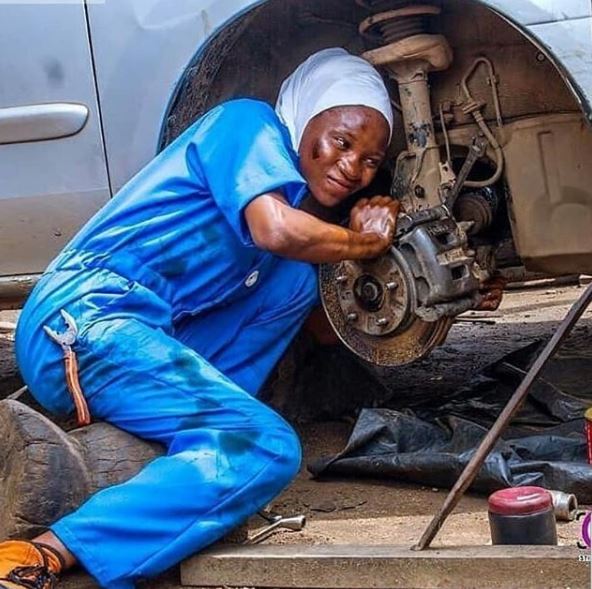 An Hausa actress, Bilikisu Abdullahi shares photo of a female mechanic on duty in Kano State.