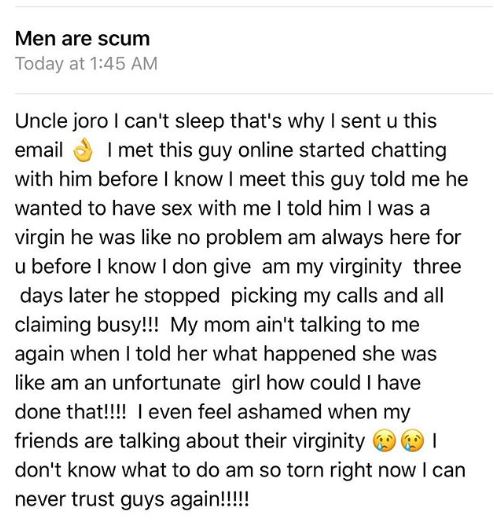 Relationship adviser and online psychologist, Joro Olumofin has shared the story of a virgin whose heart has been apparently broken by her man.