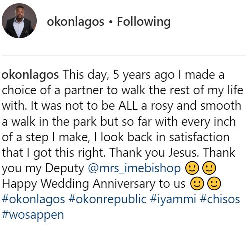 Reflecting on their journey so far, Okon shared a photo of himself and his wife on Instagram.