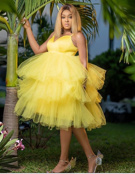 In some of the photos, the light skinned beauty wore a lovely yellow tulle dress and she paired it with cute winged high-heel shoes. Her black and gold ombre hair also complemented the outfit.