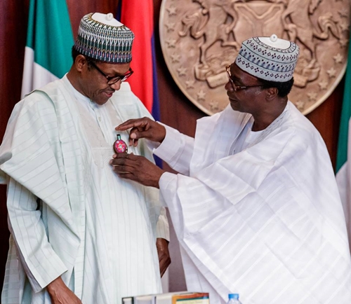 President Buhari being decorated by Chairman Nigerian Legion Brig. Gen. Adakole Akpa Rtd as he participates at the Emblem
