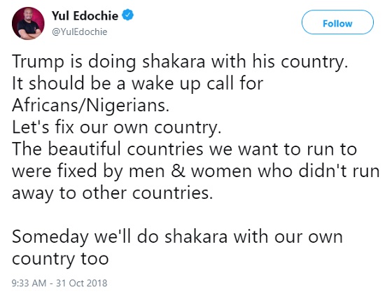 He wrote: “Trump is being proud about his country; it should be a wake call for Africans and Nigerians. Let’s fix our own country. The beautiful countries we want to run to were fixed by men and women who didn’t run away to other countries. Someday we will also be proud about our own country too."