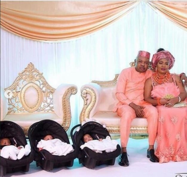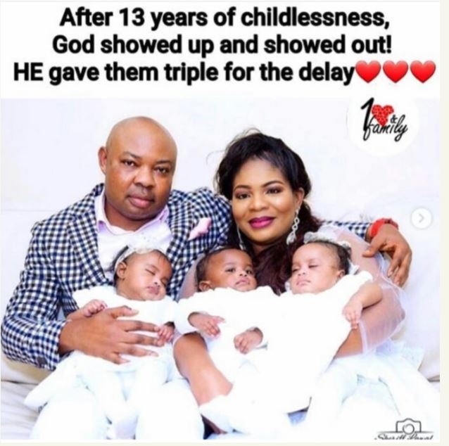 Nigerian man and his lovely wife show off their newly born triplets after after 13 years of childlessness.