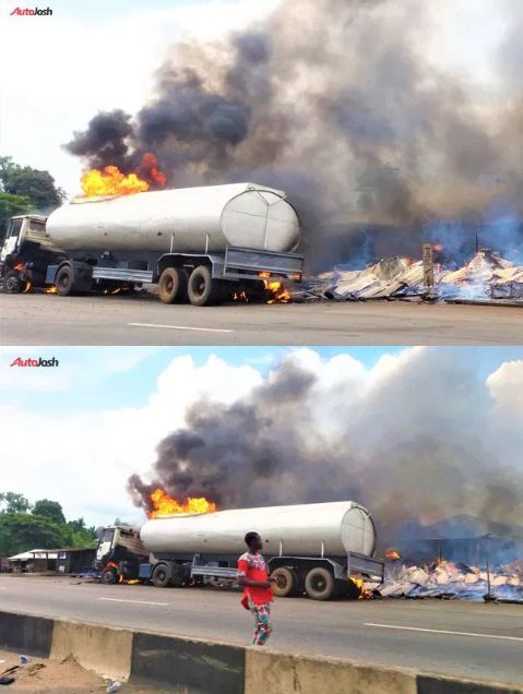 A petrol tanker suddenly burst into flames while in transit along the Lagos-Benin expressway.