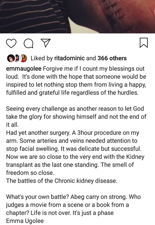 Popular Nigerian media personality, Emma Ugolee, who is still fighting to save his life from end stage chronic kidney disease, has had yet another surgery as he continues to battle the ailment.
