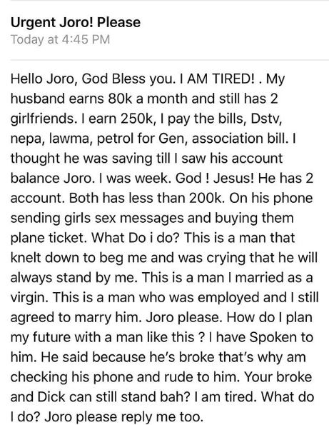 Relationship adviser, online psychologist and love doctor, Joro Olumofin has shared the story of a woman whose husband is earning N80,000 per month.
