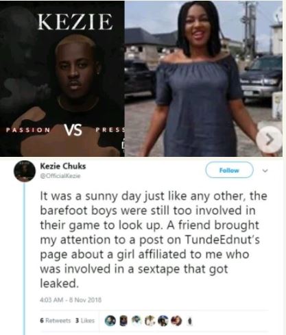 It was a sunny day just like any other, the barefoot boys were still too involved in their game to look up. A friend brought my attention to a post on TundeEdnut’s page about a girl affiliated to me who was involved in a s*x tape that got leaked.