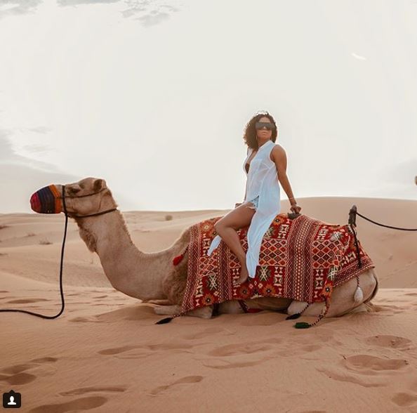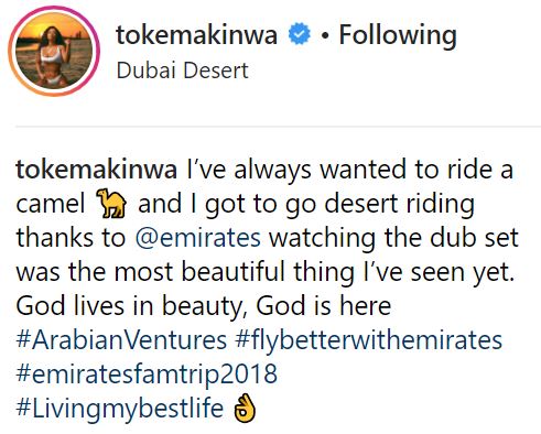 Popular Nigerian OAP, Toke Makinwa has had the chance to ride a camel for the first time ever in the city of Dubai.