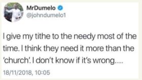 "I give my tithe to the needy most of the time. I think they need it more than the 'church'. I don't know if it's wrong," he posted via Twitter.
