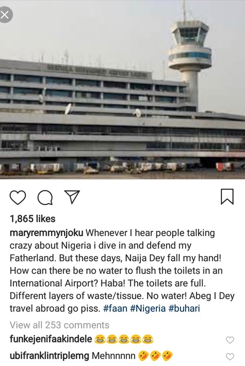 She posted a photo of the airport and wrote: "Whenever I hear people talking crazy about Nigeria i dive in and defend my Fatherland. But these days, Naija Dey fall my hand! How can there be no water to flush the toilets in an International Airport? Haba! The toilets are full. Different layers of waste/tissue. No water! Abeg I Dey travel abroad go piss. #faan #Nigeria #buhari."