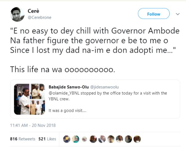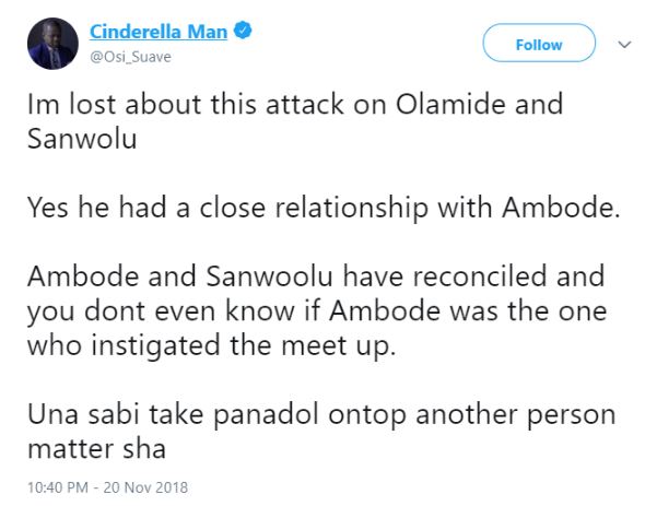 Nigerians now think he has hurriedly switched sides, but we think because Ambode and Sanwo-Olu have reconciled, that Ambode might have instigated the meet up.