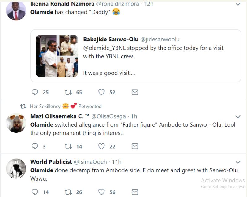 Well, Nigerians are reacting to this because Olamide was at the forefront of supporters during Ambode's bid to become Governor of Lagos in 2015. He didn't mince words in his declarationa supporting Ambode's candidature as he sprinkled the name on some of his songs.