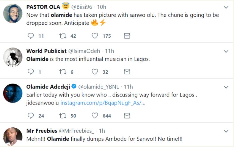 Yesterday, singer Olamide and some members of his YBNL crew met with the Lagos state All Progressives Congress (APC) governorship candidate, Babajide Sanwo-Olu.