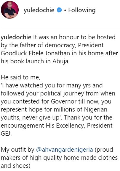 He then captioned it thus: "It was an honour to be hosted by the father of democracy, President Goodluck Ebele Jonathan in his home after his book launch in Abuja.