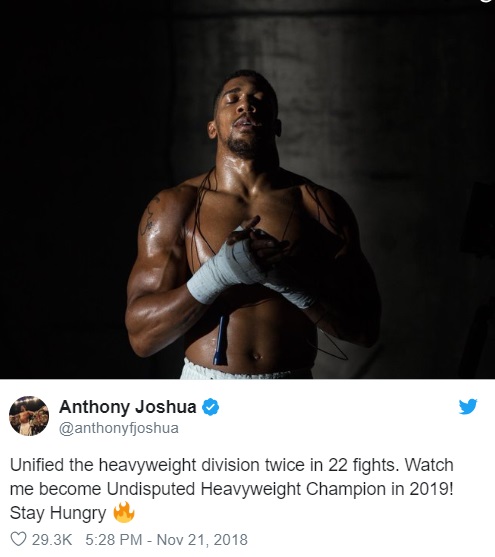 Now, he reaffirmed that he wants the WBC in 2019 by declaring: “Unified the heavyweight division twice in 22 fights. Watch me become undisputed heavyweight champion in 2019.”