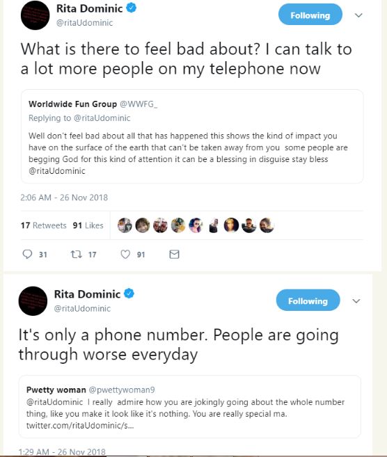 One of the casualties of the hack is Rita Dominic whose number was published on Instagram for people to contact unnecessarily.