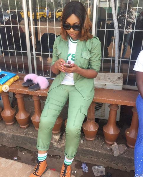 Ebube Nwagbo, 35, looked gorgeous as she rocked the full NYSC regalia on the set of Clash of Choices movie.