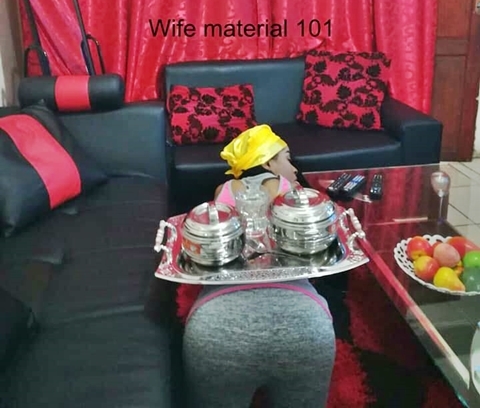 "To those my sisters/friends that are not married yet, if you cannot serve him food like this you're not a wife material and to those sisters/friends of mine that are married if you cannot serve him food like this you better go and look for where you left your wife materialism, y'all MUST use your back as a dinning table.....ah! Who slapped me now?."
