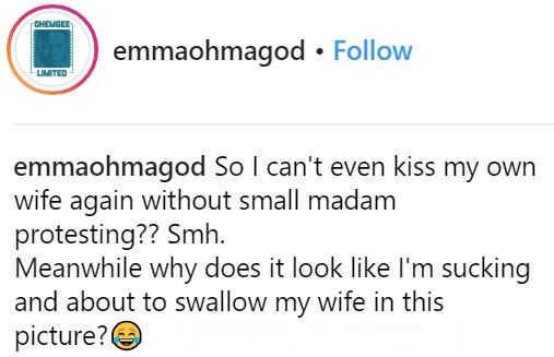 Popular Nigerian comedian, EmmaOhMaGod has released a new photo on social media showing an intimate husband-wife moment.
