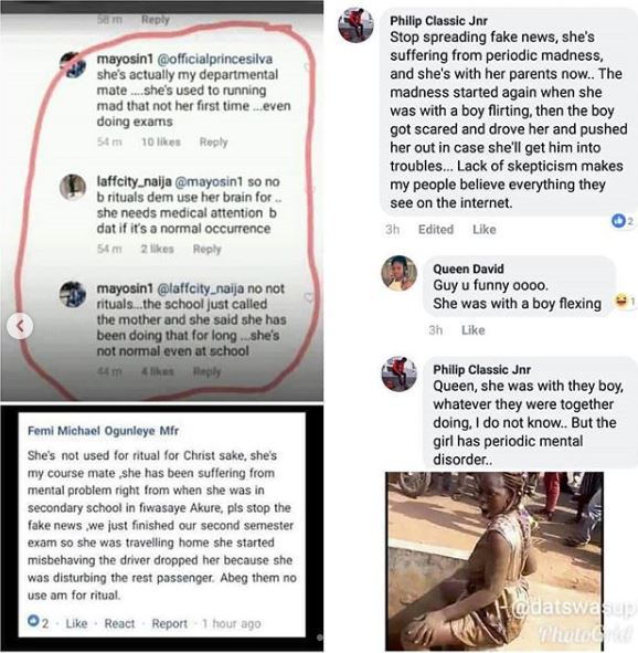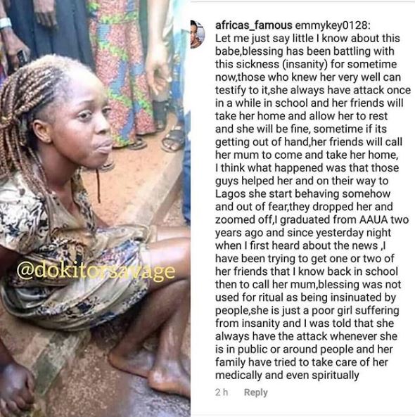 But people who have had personal ecounters with Blessing and her family members believe the media reports are false. They took to their social media accounts to reveal that the 300 level student of the department of Political Science, Adekunle Ajasin University, Akungba in Ondo State who was on her way to Lagos State has been battling with mental crisis.