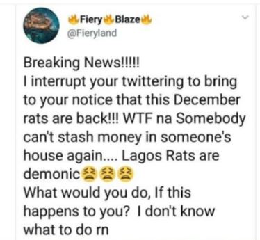 He wrote, "Breaking news! I interrupt your twittering to bring to your notice that this December rats are back!!! WTF na Somebody can't stash money in someone's house again. Lagos Rats are demonic What would you do, If this happens to you? I don't know what to do right now."