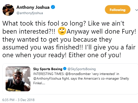 British-Nigerian heavyweight champion, Anthony Joshua, has taken to Twitter to react over a report that American heavyweight champion Deontay Wilder is ready to take on him next after his with fight Tyson Fury ended in a draw.