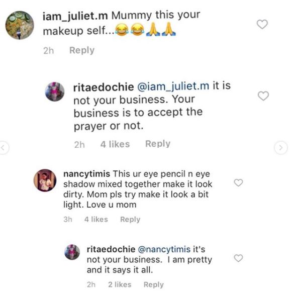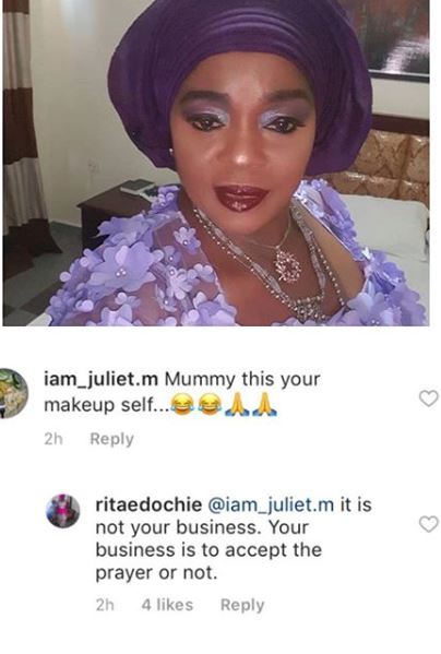 But if that was what veteran actress, Rita Edochie had in mind, she got it all wrong. She uploaded a picture of herself wearing heavy make-ups and a native dress. Some commenters on her page called her out over the make-up and it suddenly became an issue.