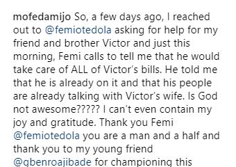 Femi Otedola has now announced he would take over the entire medical expenses after Richard Mofe Damijo who has a close relationship with the billionaire and oil magnate called him.
