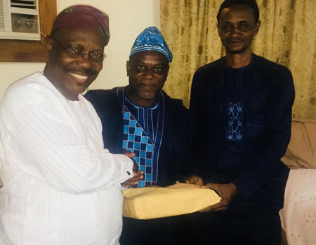Hon. Moshood Salvador presenting cash donation from the All Progressives Congress (APC) National Leader, Asiwaju Bola Ahmed Tinubu, to Rev. Bamidele Adejumo (middle).