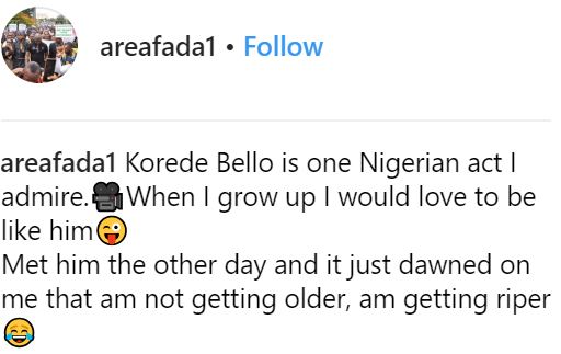 He wrote: "Korede Bello is one Nigerian act I admire. When I grow up I would love to be like him...