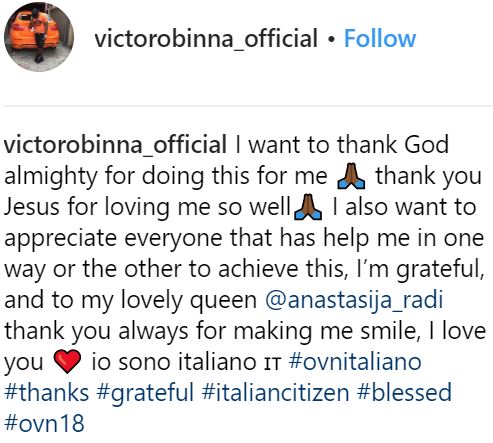 Victor Nsofor Obinna, an ex Super Eagles star is now a citizen of Italy. He made the revelation by himself on his Instagram page.