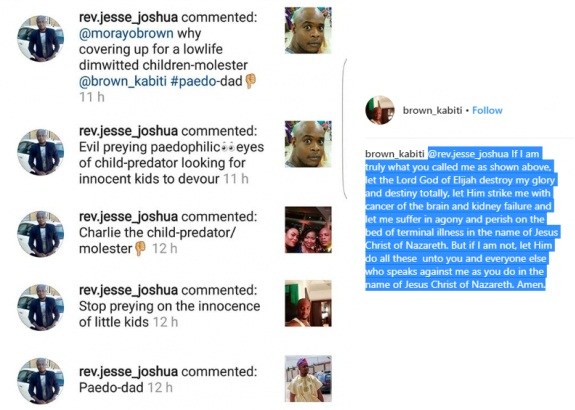 He wrote; @rev.jesse_joshua If I am truly what you called me as shown above, let the Lord God of Elijah destroy my glory and destiny totally, let Him strike me with cancer of the brain and kidney failure and let me suffer in agony and perish on the bed of terminal illness in the name of Jesus Christ of Nazareth. But if I am not, let Him do all these unto you and everyone else who speaks against me as you do in the name of Jesus Christ of Nazareth. Amen."