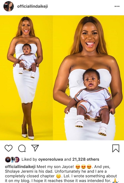 Linda Ikeji has finally shown pictures of her son, and admitted that Sholaye Jeremi is his father, adding that they're now completely a closed chapter.