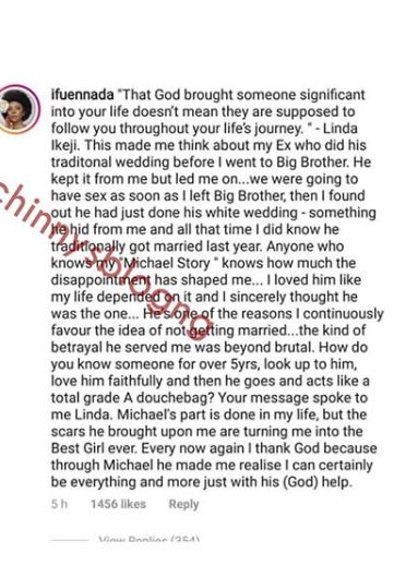 Weighing in on Linda Ikeji's aborted romance with Jeremi Sholaye, Big Brother Naija reality show star, Ifu Ennada has recounted her relationship woes.