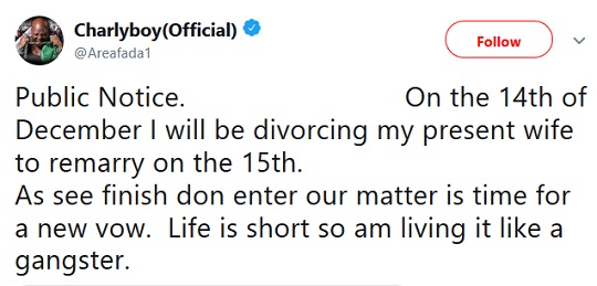 Nigerian singer, Charles Chukwuemeka Oputa, popularly known as Charly Boy, has taken to his Twitter page to reveal his plans to divorce his wife on December 14, 2018, and remarry the next day.