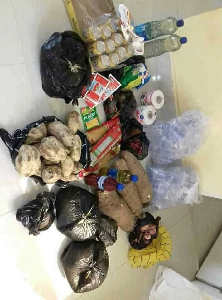 The items include: 3 tubers of yam, close to 20kg of potatoes, half carton of malt drinks, four bags of sachet water, 2 measured bottles of kerosene, tissue papers, measured groundnut and palm oil, amongst others.
