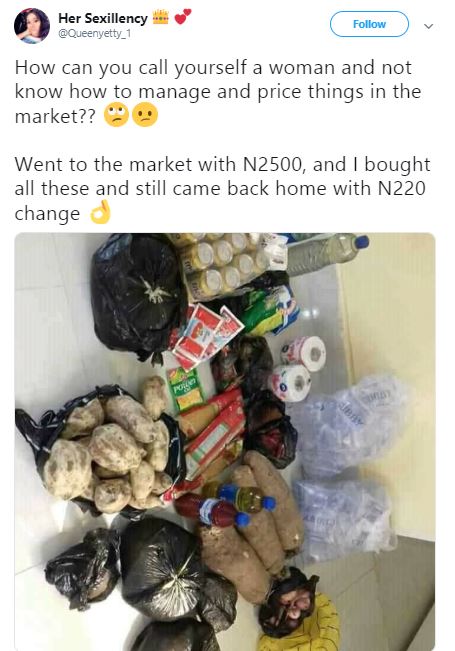 A Twitter user, @Queenyetty_1 has come under severe criticism after she showed off food items she reportedly bought for N2,280.