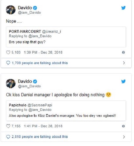 Responding to a fan who inquired to know the true story, Davido said he didn’t slap Kizz Daniel’s manager, he, however apologized for the sake of peace.