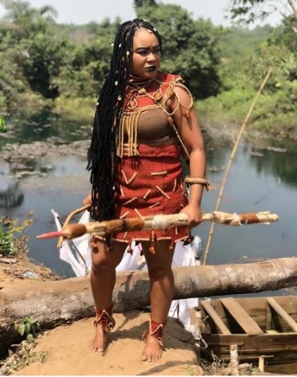 Rachael Okonkwo popularly called Nkoli Nwa Nsukka was pictured on the set of an epic movie where she is playing the role of a local hunter.