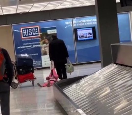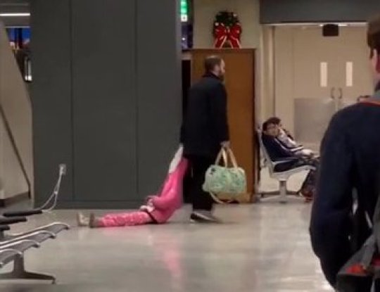 In the video, the girl has her hands clasped in her lap as she’s dragged across the airport floor, clearly not objecting to her treatment.