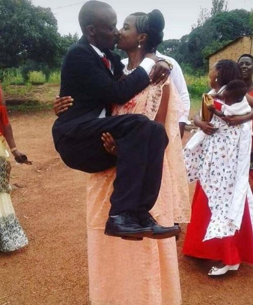 A seemingly strong woman decided to carry her man as they kissed on their wedding day.