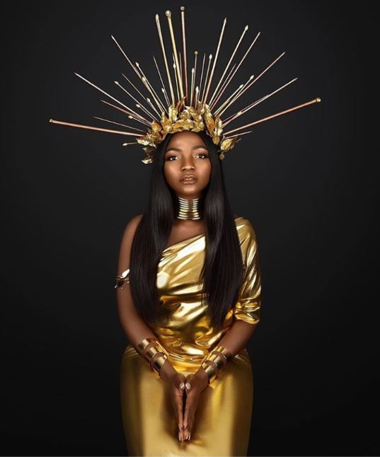 Singer, Simi who just got married to her heartthrob, Adekunle Gold wows in gorgeous photo as she rocks a gold dripping half off-shoulder dress with a dramatic head crown in gold.